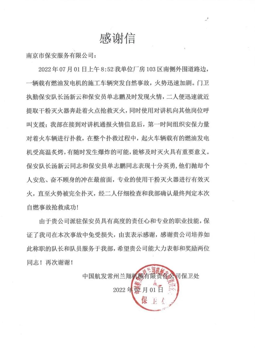 近期,南京市保安服務(wù)有限公司收到了一封來自中國航發(fā)常州蘭翔機(jī)械有限責(zé)任公司保衛(wèi)處的感謝信,信中對駐點保安員湯新云和單志鵬不顧自身安危、奮不顧身,及時處置火情保護(hù)駐點安全的行為表示衷心感謝。